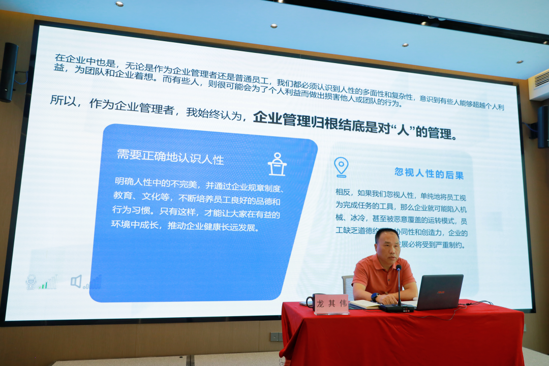 培訓(xùn)中,龍其偉總裁以“人性與企業(yè)管理”為主題,通過(guò)分享視頻和生動(dòng)事例解碼人性本質(zhì),指出人性是生物本能與社會(huì)屬性交織的復(fù)合體,既包含趨利避害的生存本能,又蘊(yùn)含向善求真的精神追求。