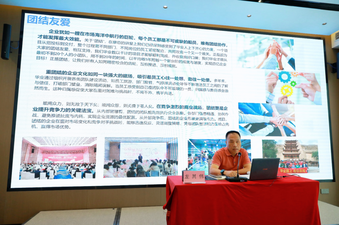 在“人性與企業(yè)管理的融合”篇章,龍其偉總裁強(qiáng)調(diào)企業(yè)管理歸根結(jié)底是對(duì)“人”的管理。他結(jié)合集團(tuán)實(shí)際,與大家分享華業(yè)如何通過(guò)“守信用、講道德、知感恩、重團(tuán)結(jié)”四大基石構(gòu)建具有華業(yè)特色的人性化管理體系。